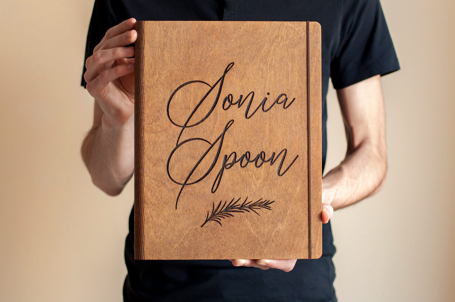 Shop our custom recipe binders for keeping all of your favorite recipes. Keep generations of family culinary creations neatly filed in this beautifully designed recipe binder. This will be etched in a beautiful script font.
